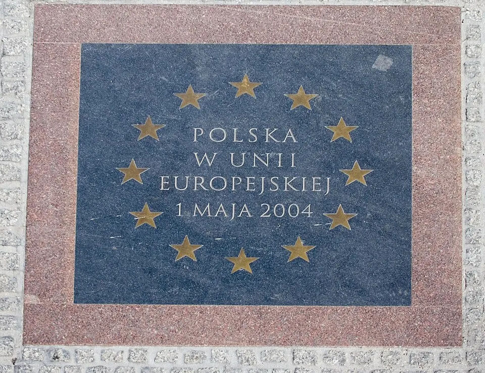 Пам’ятна табличка в Кракові про вступ Польщі до ЄС. Фото: Івона Грабська / WikimediaПідтримка членства Польщі в Євросоюзі залишається високою, хоча в останні роки вона зменшується. Рекордна підтримка зафіксована в червні 2022 року: тоді вона становила 92 %, нині — 77 %. Що цікаво, такий самий результат був під час референдуму щодо вступу Польщі до Євросоюзу, проведеного 2003 року.