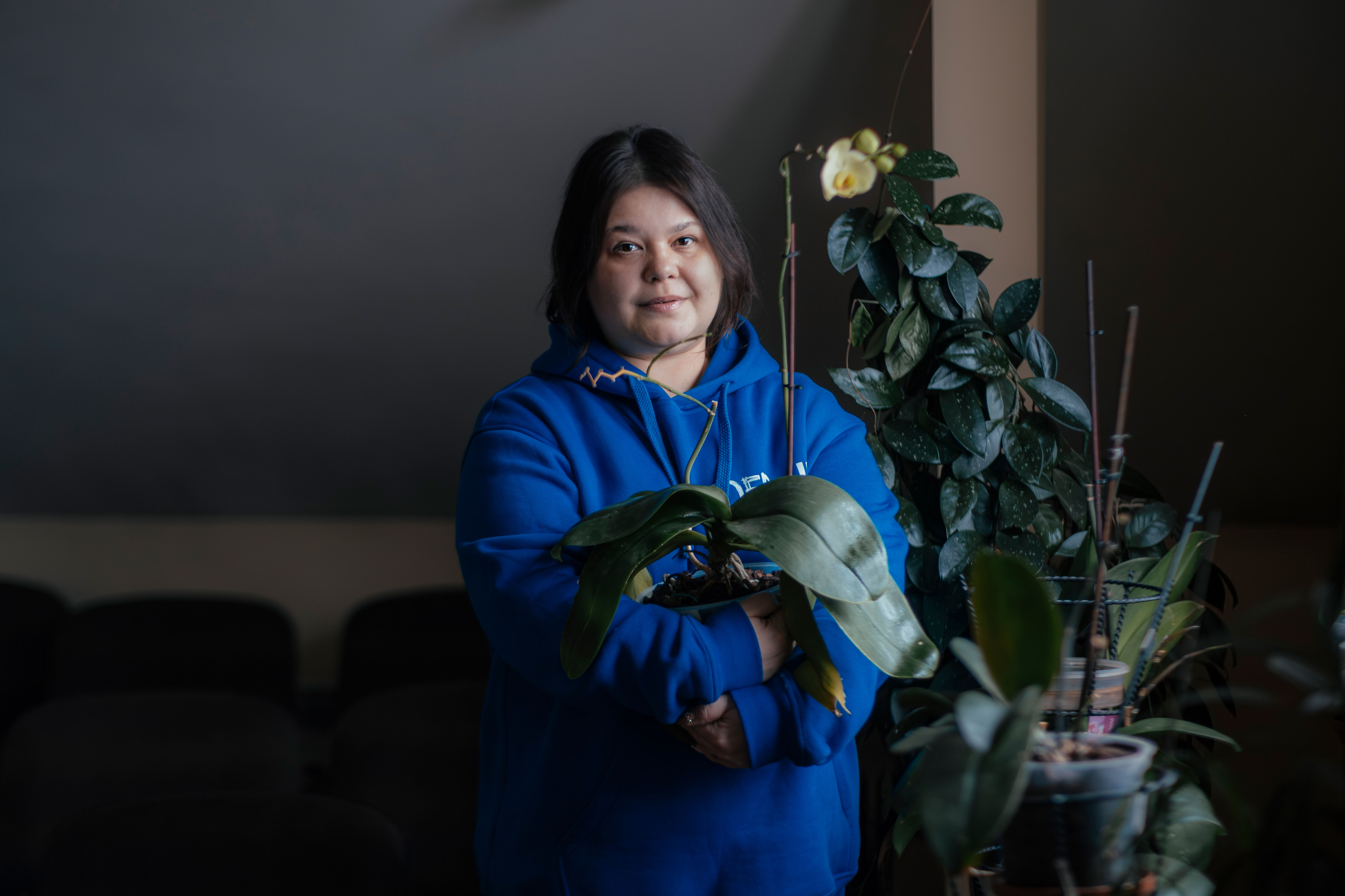 Оксана розвертає горщик так, щоб квітка була більше до світла.