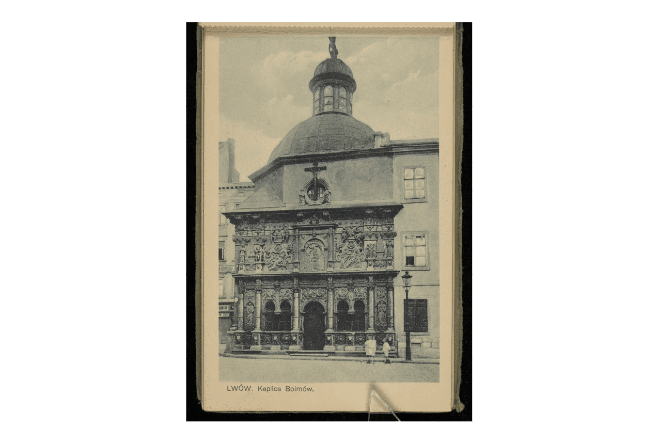 Каплиця Боїмів. Джерело: Національна цифрова бібліотека POLONAНайцікавішим елементом каплиці є скульптура Скорботного Ісуса на куполі. Христос сидить, а не традиційно висить на хресті. Під скульптурою напис латиною: «Перехожий, зупинись і подумай, чи твоє страждання більше, ніж моє».