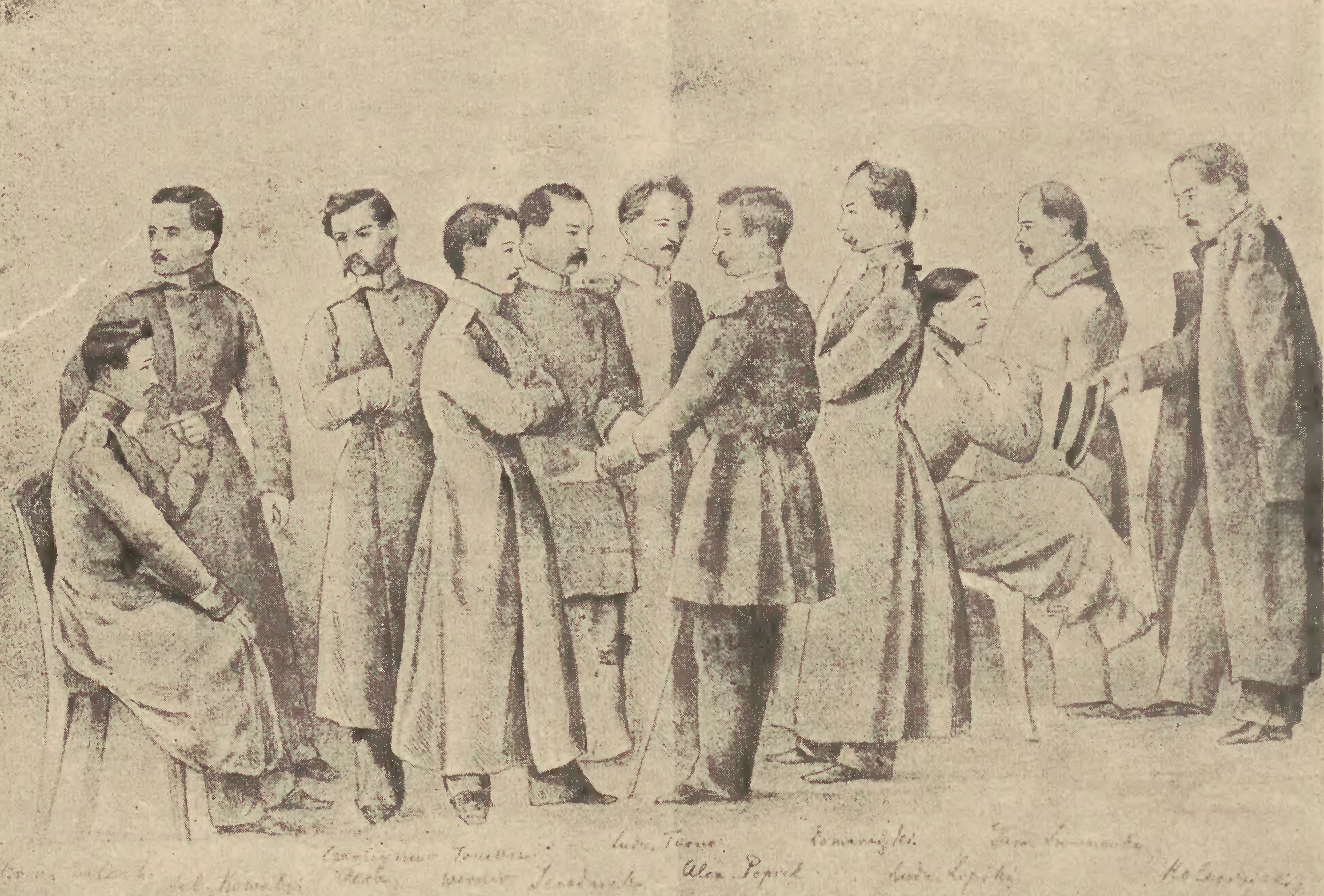 Броніслав Залеський. Джерело: Biuletyn Polsko-Ukraiński, 1934Тут Шевченко зближується з цілою польською колонією Оренбурга. Польські засланці влаштували на його честь бенкет. Найближчі стосунки він мав із Броніславом Залеським, Зиґмунтом Сераковським, Яном Станкевичем, Людвіком Турно, ксьондзом Міхалом Зельонкою та Аркадієм Венґжиновським, про що свідчить його приятель-українець Михайло Лазаревський, який був у Оренбурзі чиновником. Подаємо тут репродукцію з копії малюнка, який зберігався в Аркадія Венґжиновського в Одесі 1888 року. Бачимо на ній Шевченка в групі польських засланців. На ній немає ксьондза Міхала Зельонки, Венґжиновського й Сераковського, але є особи, яких Лазаревський не згадав: Олександр Попель, Євстафій Середницький, Бальтазар Колесінський, Юліан Ковальський, Станіслав Домарацький і Людвік Липський. Малював цю групу росіянин Олексій Чернишов.