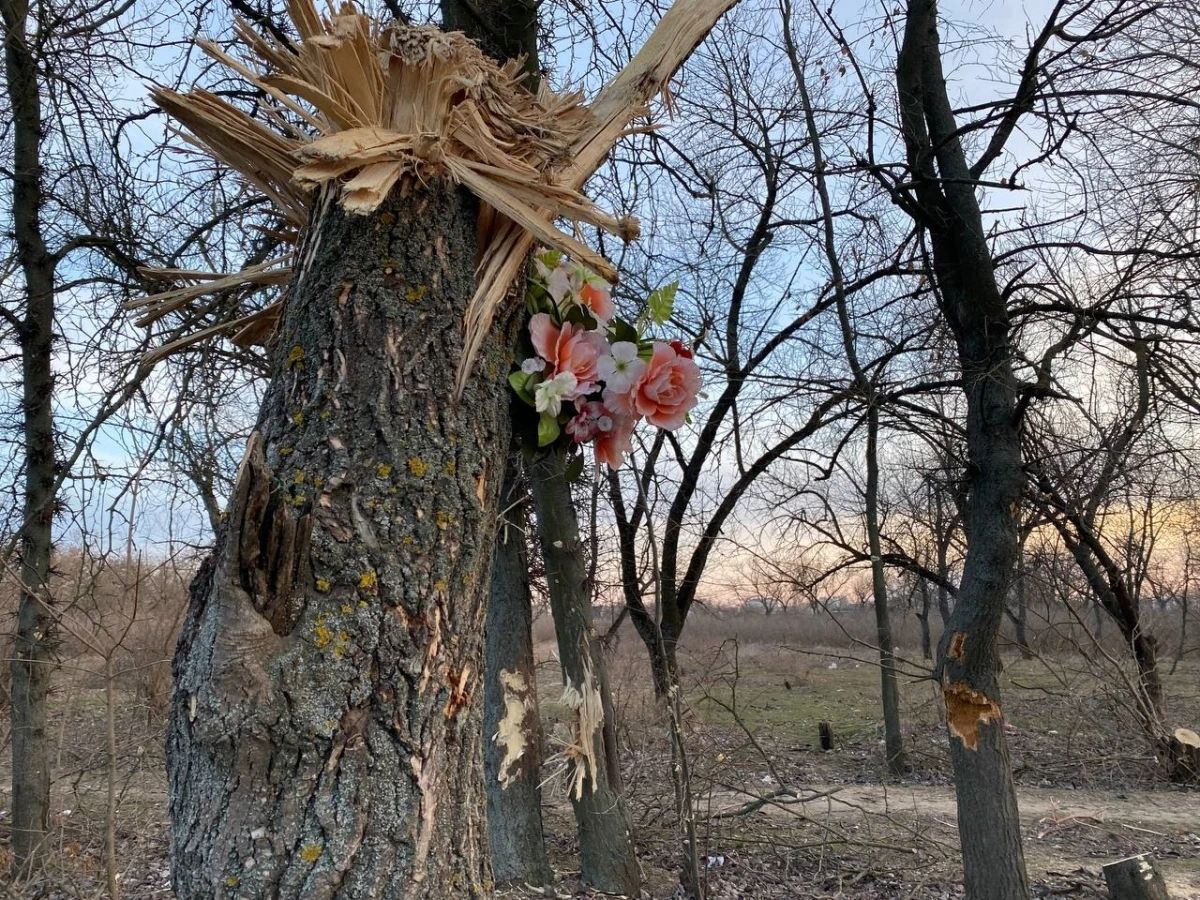 Бузковий парк. Дерева пошкоджені кулеметним вогнем. Місце загибелі 36 людей із тероборони Херсону. Фото: Єлєна Костюченко / Новая газетаХерсонський журналіст Костянтин Риженко розповідає: