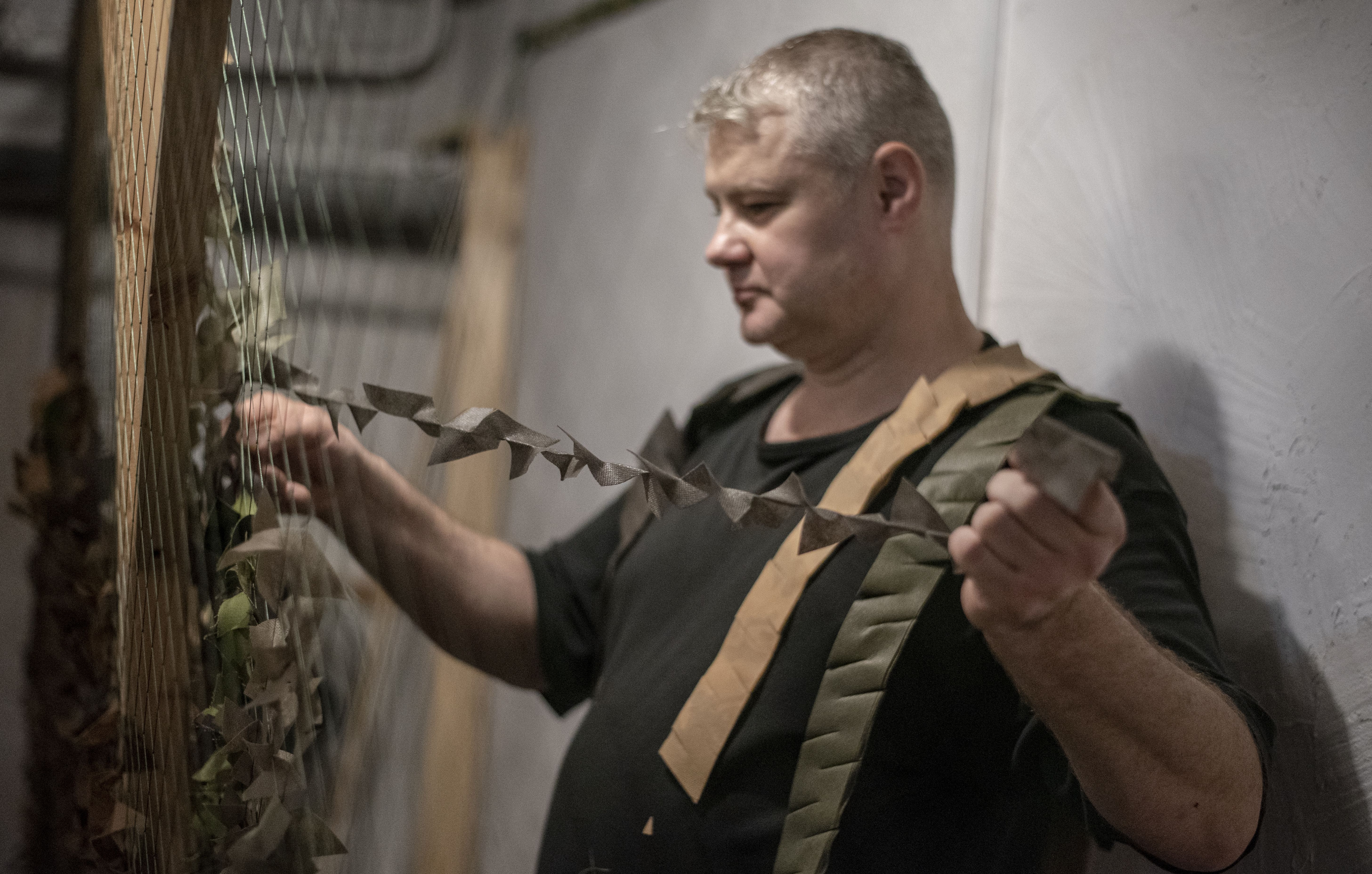 Велетенські дерев’яні рами з вбитими кілками, на яких натягнута зелена камуфляжна сітка. Дві дівчини вміло пов’язують на них смужки різних відтінків кольору хакі.